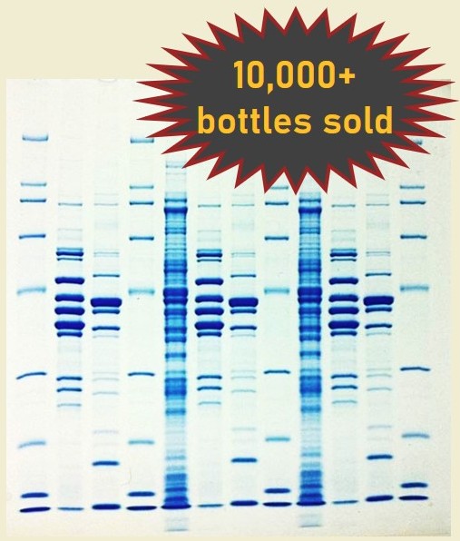 | One-step in 10 minutes Other “fast” gel staining technologies require expensive equipment or trade speed for reduced clarity of the protein bands. AcquaStain doesn’t. And no other “fast” product is as fast, either—the entire staining procedure can be completed in about 10 minutes (for typical protein amounts). Don’t worry, though; it’s impossible to over-saturate with this product, so you can safely incubate overnight with no harmful effects. Only AcquaStain provides a reasonably-priced reagent without the need for an external apparatus while delivering a super-sensitive signal—equivalent to or better than the best Coomassie-based reagents on the market. Protein bands really stand out, too, because the gel background remains crystal clear. AcquaStain is a teal color that’s totally free from precipitate. Shaking before use is not necessary. It’s like nothing you’ve tried before. |