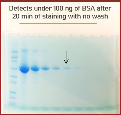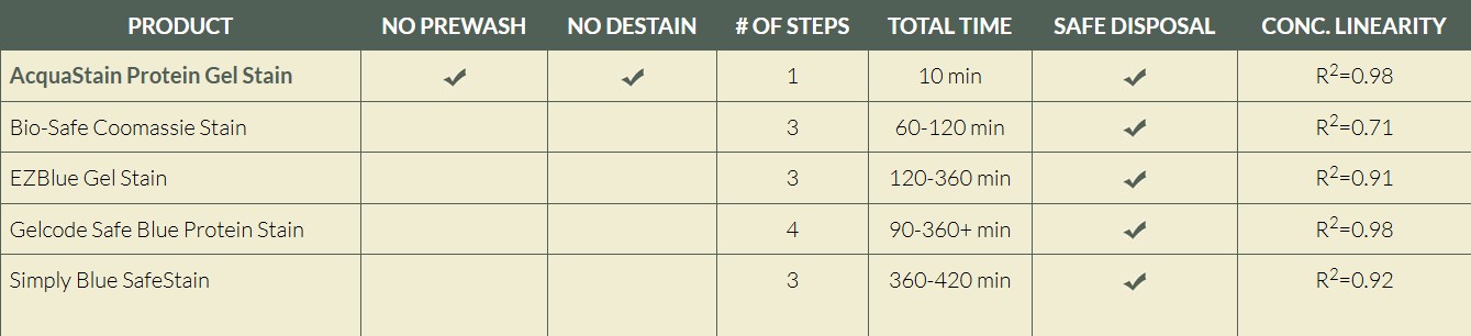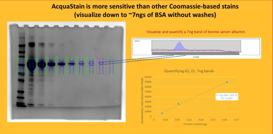 | AcquaStain will show greater signal even at low concentration of protein (60ng) within 10-15 minutes and down to 10ng (longer incubation). The signal generated by this stain is linear, enabling true quantitation of your sample. |