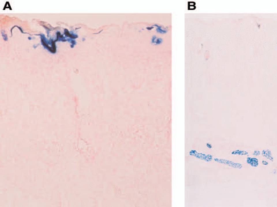 . ß-Galactosidase expression on d 1 (A) and d 7 (B) after the pCAGGS-lacZ transfer with electroporation at 18V. ß-Galactosidase was expressed in the upper most cell layers (horny, granular, and prickle cell layers) of the epidermis on d 1 (A), and in the subcutaneous muscle layer on d 7 (B). Magnification: (A) x 250, (B) x 70 . |