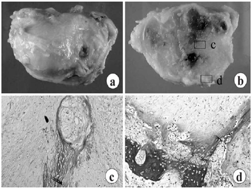Gross and microscopic findings of the resected tumor. a) Gross appearance of marginally resected tumor. b) Cut surface. c) Microphotograph of the central portion of the tumor (area c in panel b). d) Peripheral region (area d in panel b).