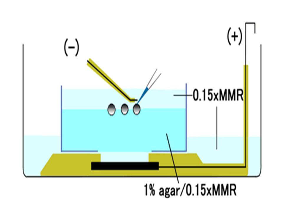 Fig.(1) shows the general setting of the electroporation. Vitelline membrane of the embryo (st.12-13) is usually kept intact. Inject 5-10nl of GFP-mRNA(1µg/µl, 0.05% Fast Green) into intercellular space of upper-few epithelial layers of the neural plate, and immediately after injection (leaving the needle in the embryo) the electric shock (20-22V, 5msecON, 95msecOFF, 10 shocks) is given by the micro-electrode.