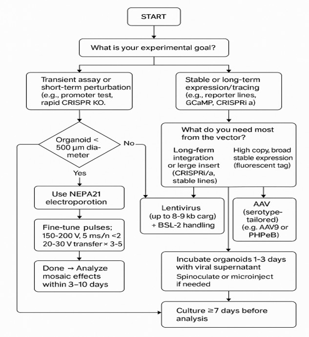 How labs decide based on organoid state, lumen access, cargo size, and mosaic vs stable expression.